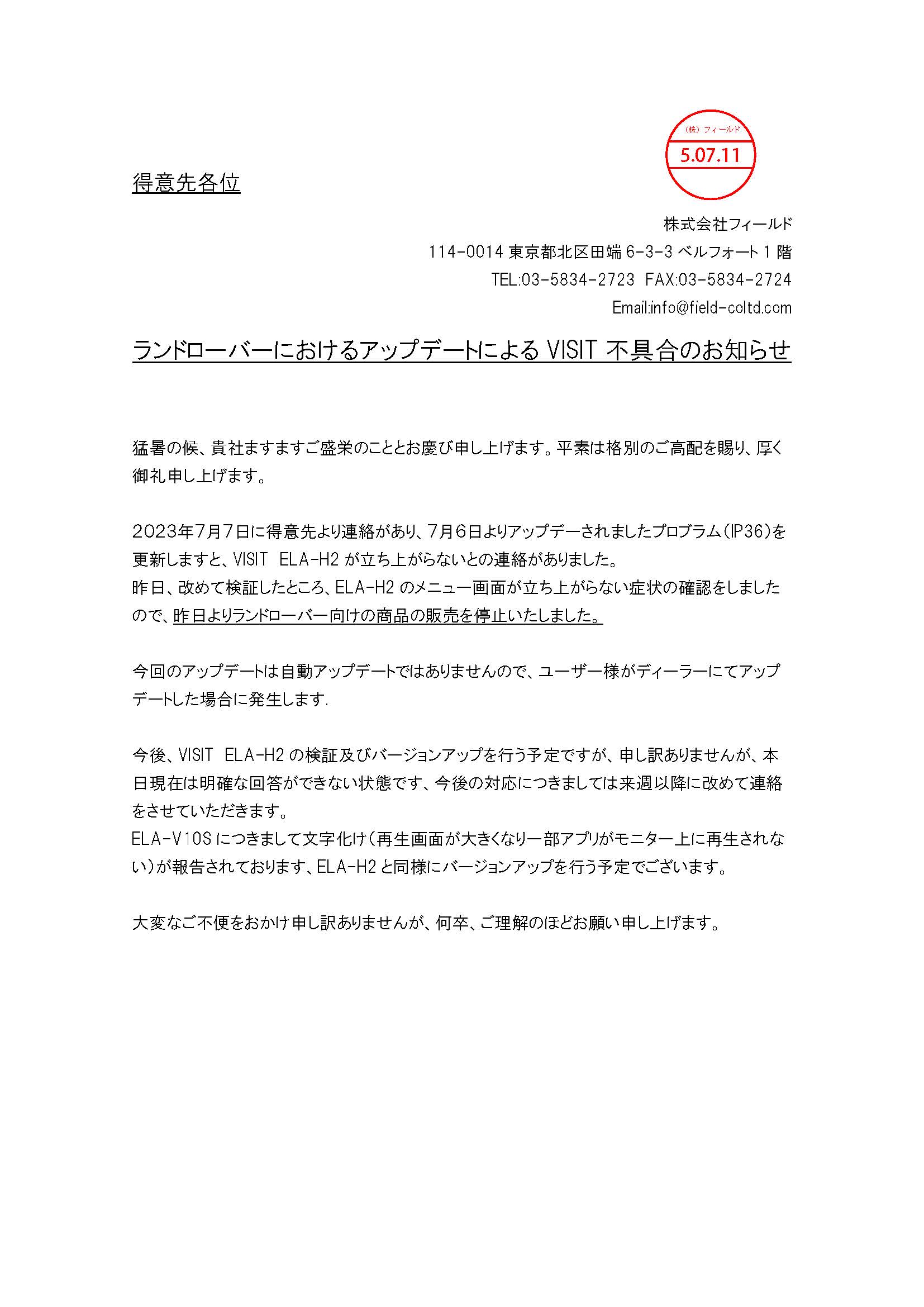 / 最終更新日 : STAFF News & Topics VISIT 適合情報(ランドローバー) ランドローバー ディフェンダーの2023年式の一部車両で純正カープレイのアップデートの影響によりVISITが起動できない症状が確認されております。 また、今まで動作できていた車両でもアップデートすることで起動できなくなる恐れがございます。VISITを設置前に動作確認を行って下さい。 FacebookXBlueskyHatenaCopy